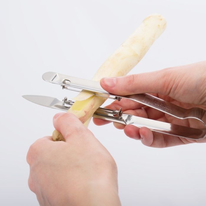 Aldrig har det gått så snabbt och smidigt att skala sparris som med Westmarks Sparrisskalare Dubbel "Asparago Due". Med en tångliknande design och dubbbelslipade blad på båda sidor är är den optimal.